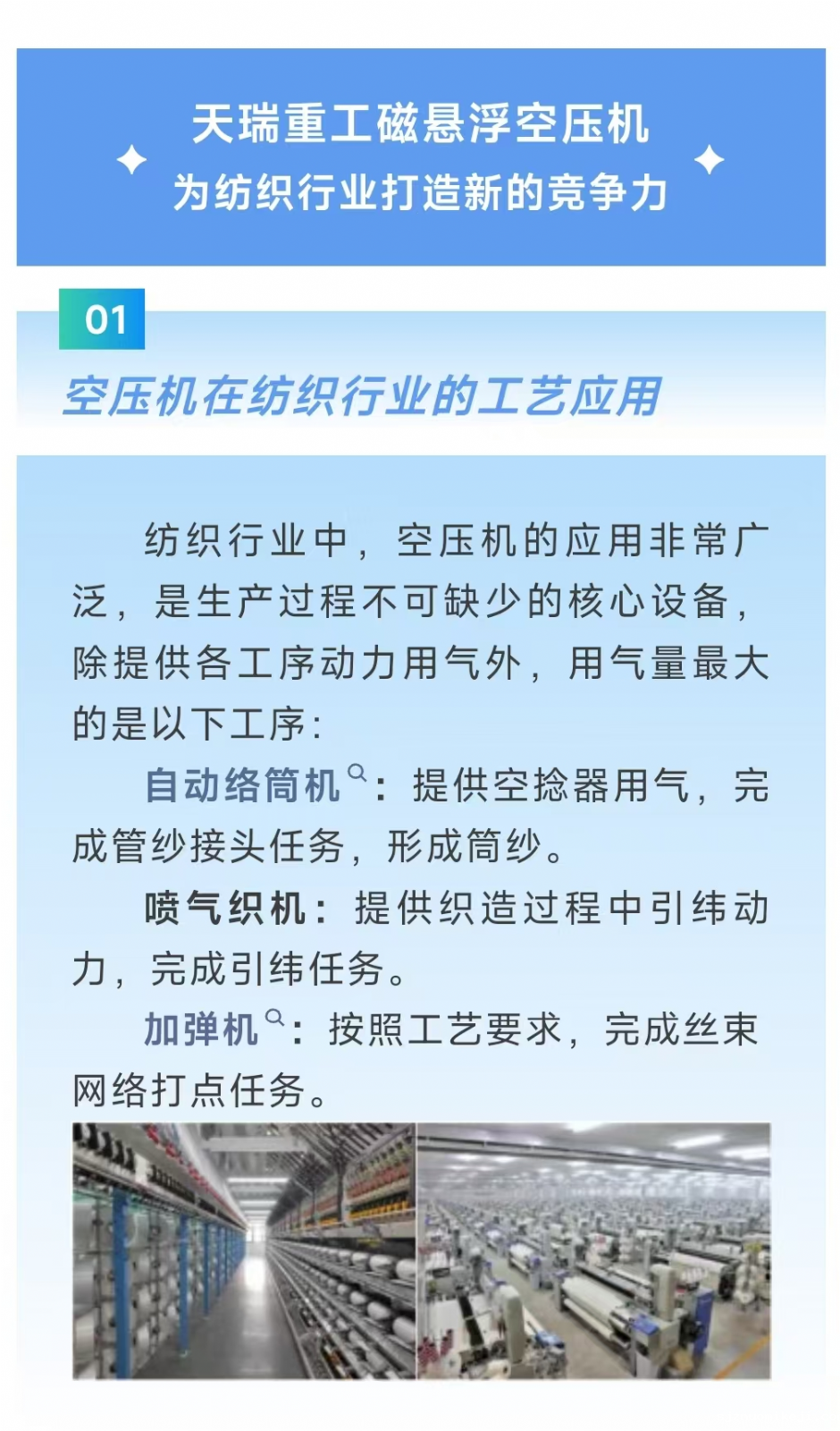 纺织行业中,空压机的应用非常广泛,是生产过程不可缺少的核心设备,除提供各工序动力用气外,用气量大的是以下工序: